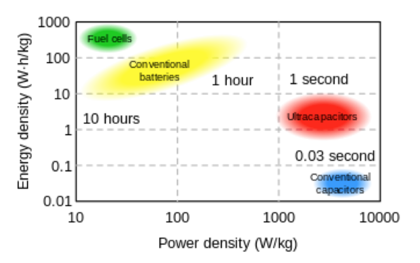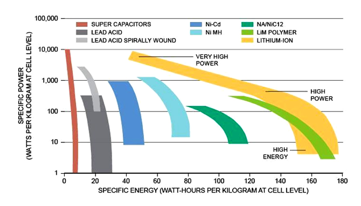 The Ragone plat helps to compare the different energy storage technologies by their power and energy characteristics (see Figure 2).